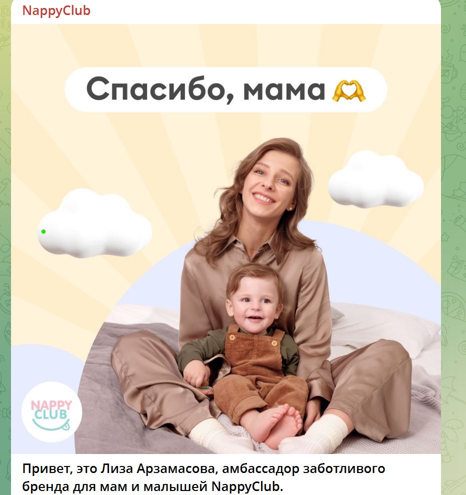 Молодая мама, прекрасная актриса и человек с очень хорошей репутацией, Лиза Арзамасова, стала амбассадором бренда NappyClub. Ценность бренда NappyClub — забота, и логично, что ее транслирует заботливая мама малыша.