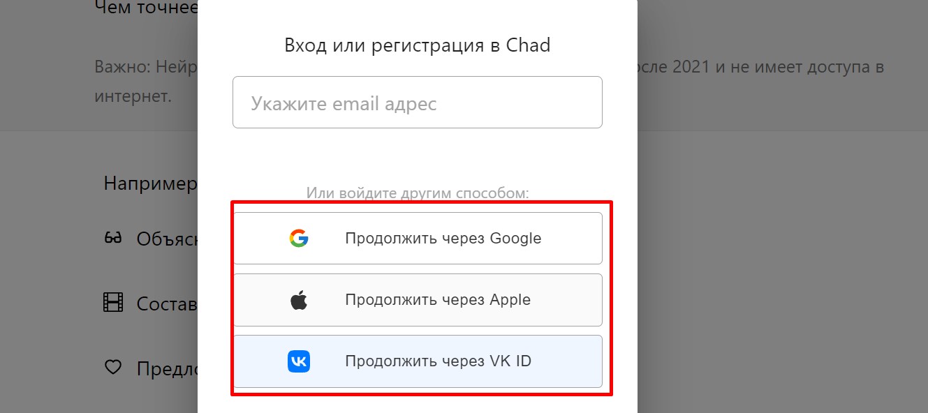 Пример: войти в нейросеть Chad можно по данным в социальных сетях.