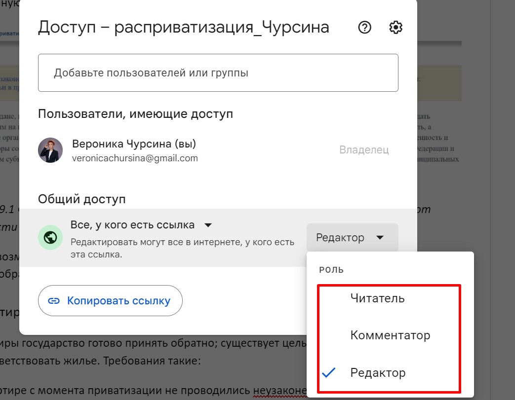 - Доступ по роли/ролевой доступ. В этом случае разрешенные действия устанавливает владелец файла, сайта или системы. Например, это может быть доступ по должности — только бухгалтер имеет доступ к налоговой отчетности, а, скажем, инженер-технолог той же организации или делопроизводитель — нет. Наглядно это можно продемонстрировать на примере работы в Google Docs: