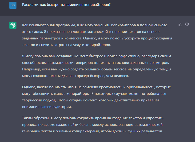Сервис незаменим, когда дело касается ускорения каких-либо процессом написания текстов, но вот особого креатива ждать от него не стоит. Да, владение чат-бота речью впечатляет, но до живого интеллекта ему еще далеко.