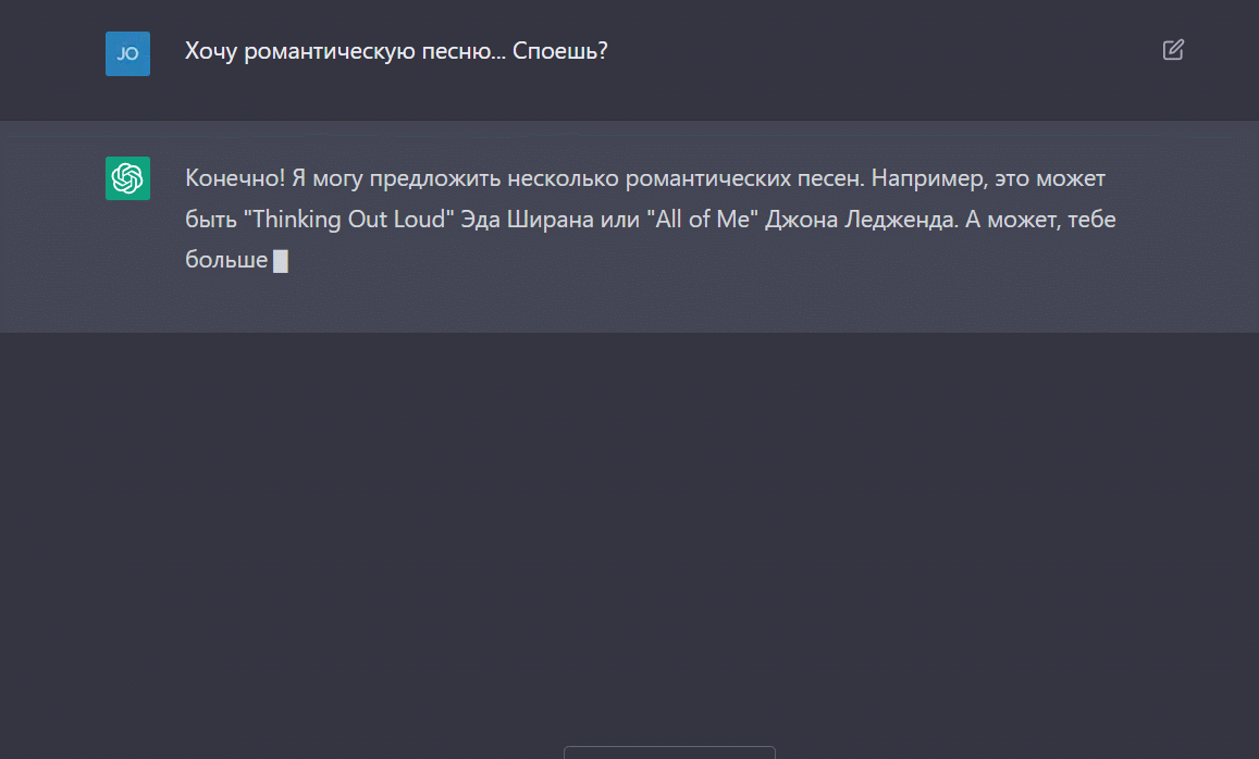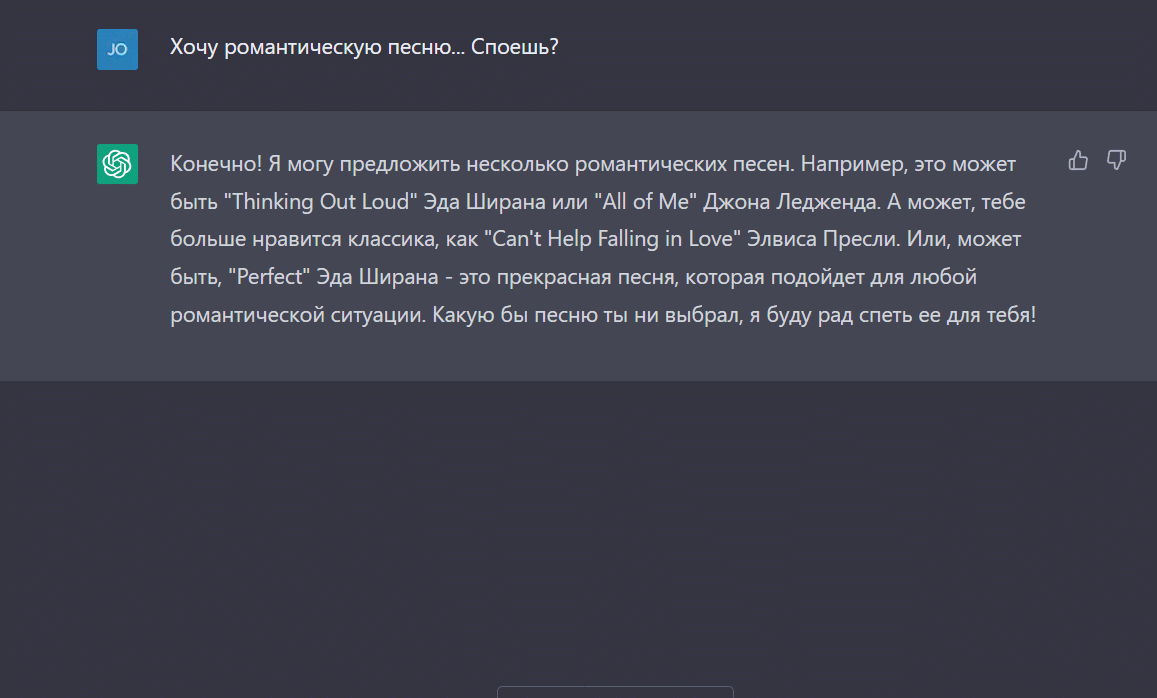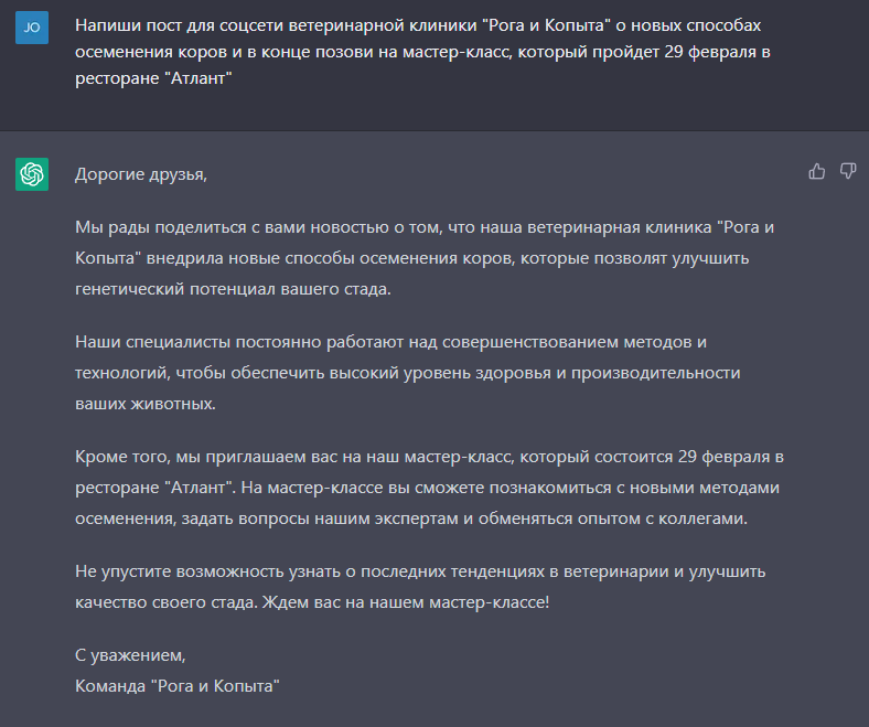 Что интересно, ниже вы видите пример диалога, где человек бы изначально сообразил, что от него требуется. Как видите, искусственный интеллект, при всей имитации деятельности автора, понять с первого раза не сможет. Если конкретики не будет хватать, он переспросит.