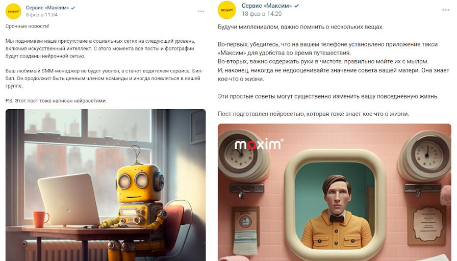 Маркетологи такси «Максим» не стали надолго задумываться и решили отдать ведение своего сообщества в «ВК» нейросети. И даже сделали резонансный пост на тему того, что SMM-специалист переведен в водители сервиса. Правда, в информации постов проскальзывает то, что специалист еще на месте и, скорее всего, просто учится задавать грамотные запросы нейросети.