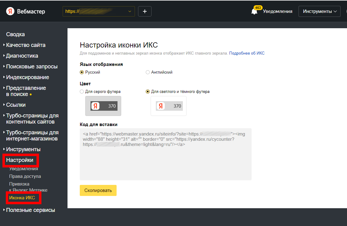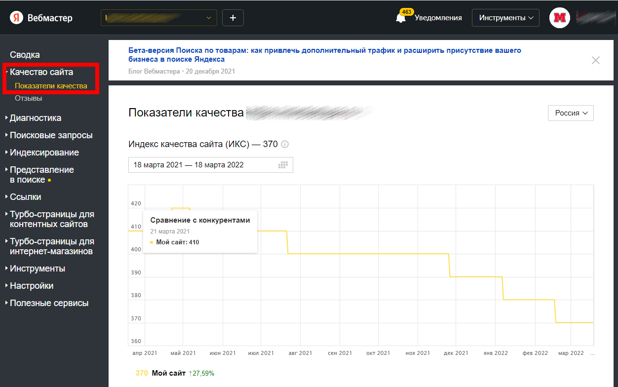 Это основной способ для владельца сайта. Значение ИКС отображается на главной странице сводки, но только после добавления и подтверждения прав на сайт. Здесь же, в «Вебмастере», можно увидеть динамику показателя и уведомления о его изменениях.