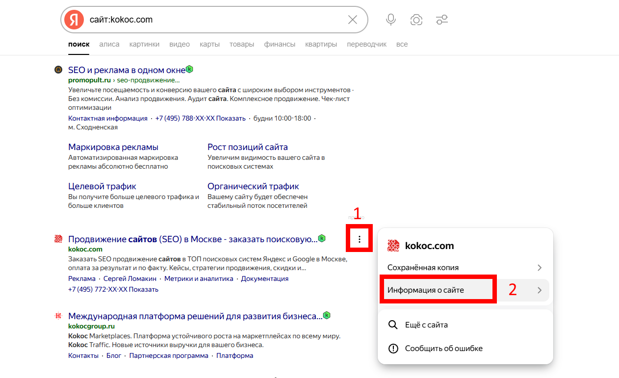 В результатах поиска, рядом со сниппетом, нажмите три вертикальных точки. Затем нужно нажать на кнопку информации о сайте: