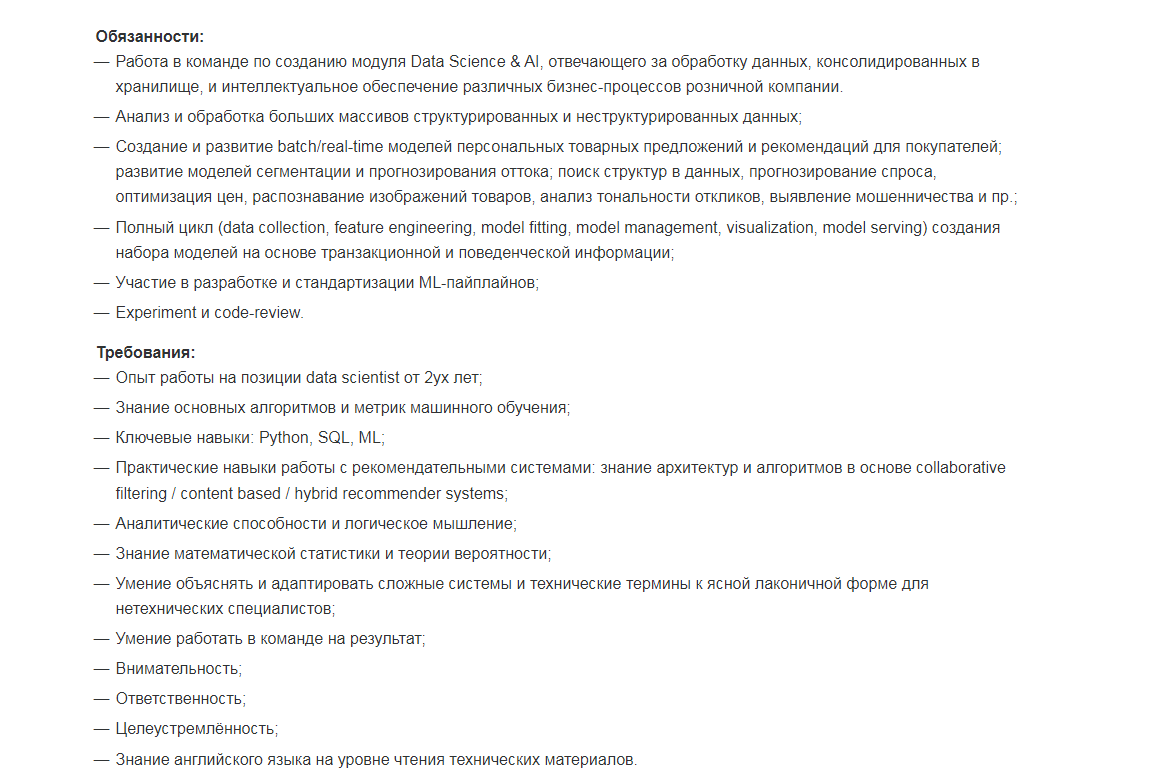- Типичные задачи. Подготовка дизайна экспериментов, выбор и настройка моделей, продвинутая валидация, совместная работа с инженерами по данным. Также нужны навыки взаимодействия с ML-инженерами — над пайплайнами (конвейерами обработки данных).