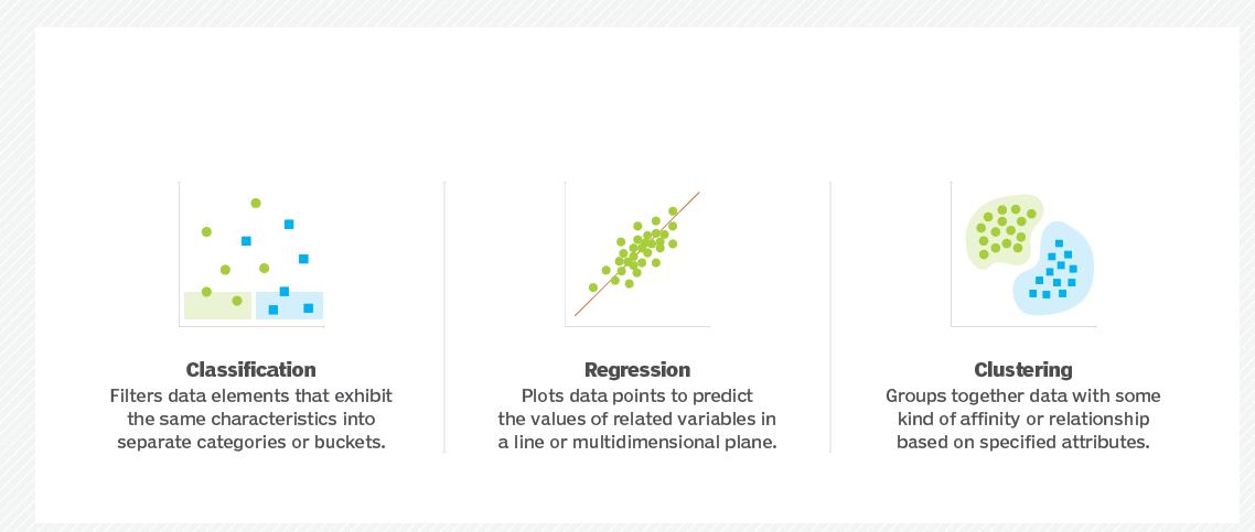 - Коммуникация: исследовательский и подтверждающий анализ, прогнозный анализ, регрессия, анализ текста и качественный анализ.