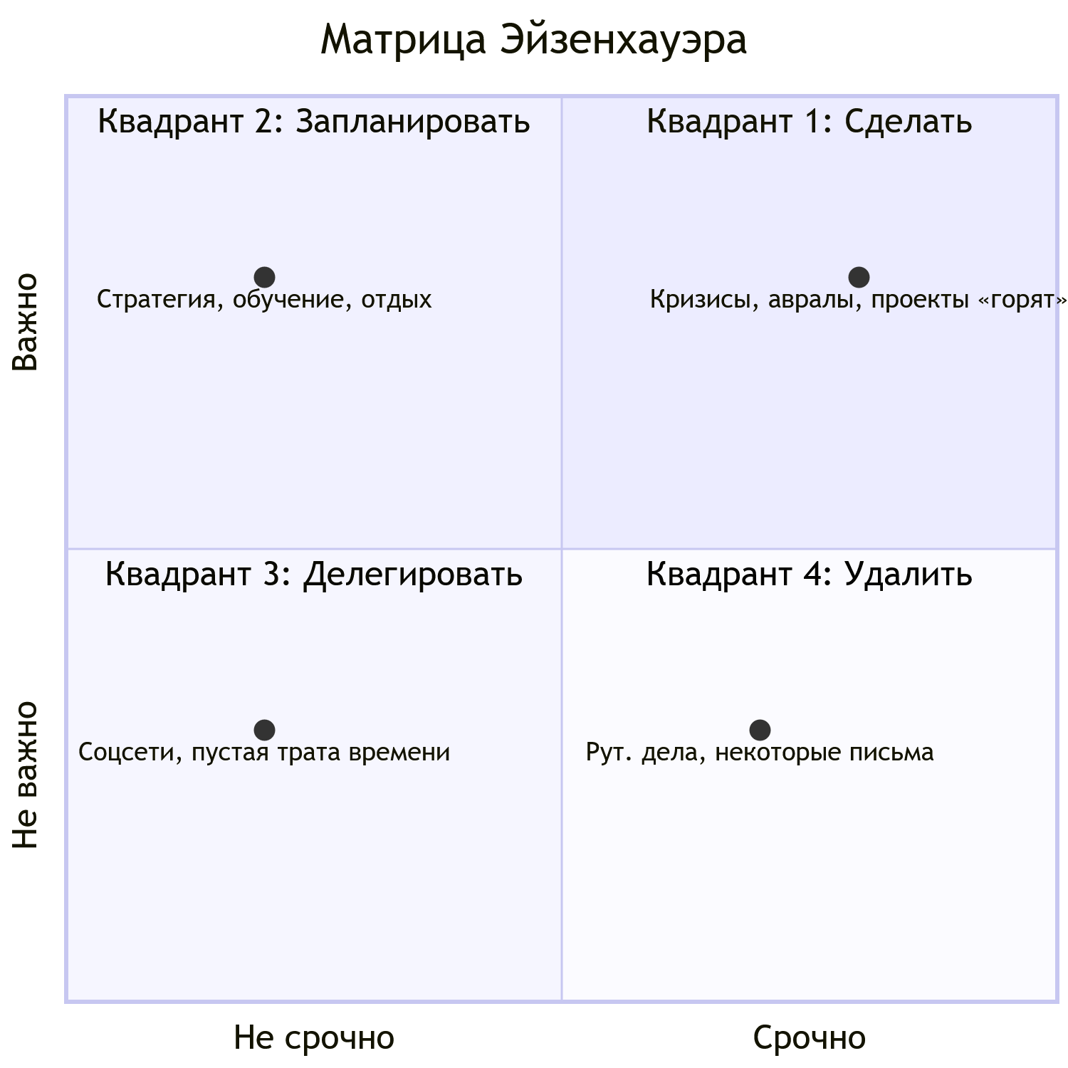 Президент США Дуайт Эйзенхауэр говорил: «Что важно, редко бывает срочно, а что срочно — редко важно». Его матрица помогает разделить все задачи на 4 категории и понять, какие из них на самом деле приближают вас к дедлайну.