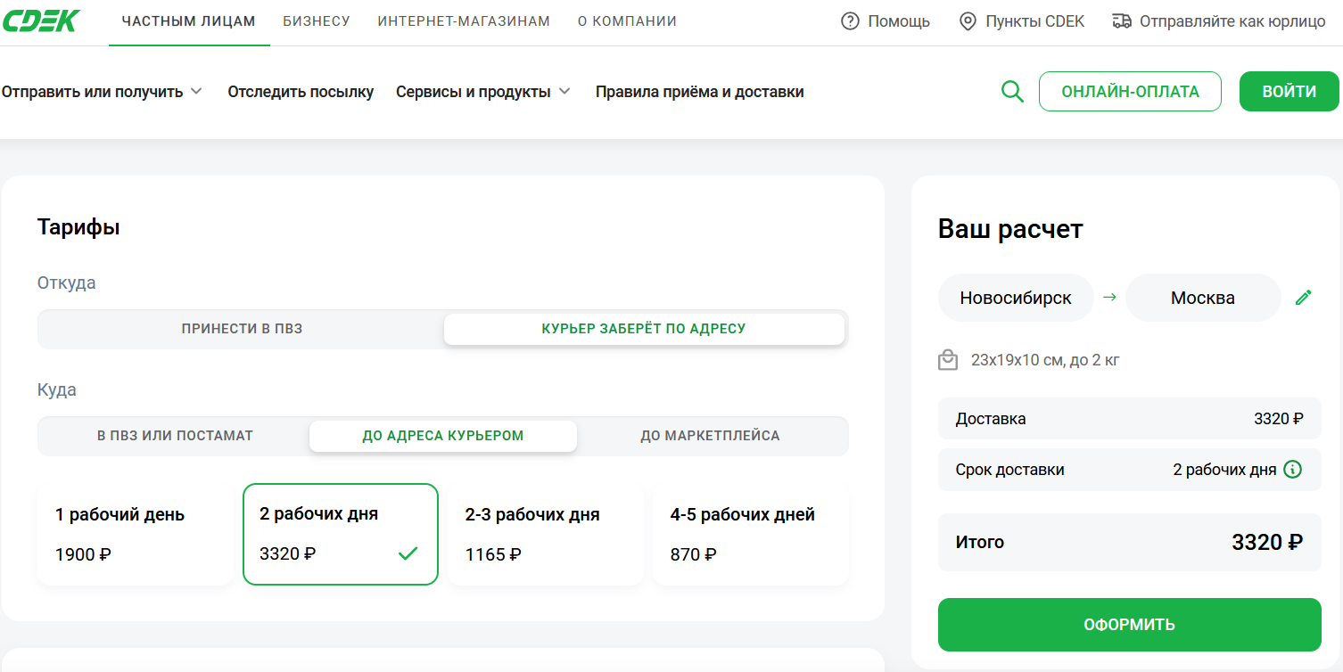 Воспользуемся калькулятором популярной службы — CDEK. Если курьер заберет посылку по адресу в Новосибирске, затем компания доставит ее в Москву, а далее уже московский курьер привезет ее до двери покупателю, это будет стоить 3 320 рублей. Размер посылки при этом — 23x19x10 см, вес до 2 кг. Обратите внимание на срок: он составит всего-навсего 2 рабочих дня, что очень быстро для расстояния в 2809 км по прямой или 3 388 км по дорогам.