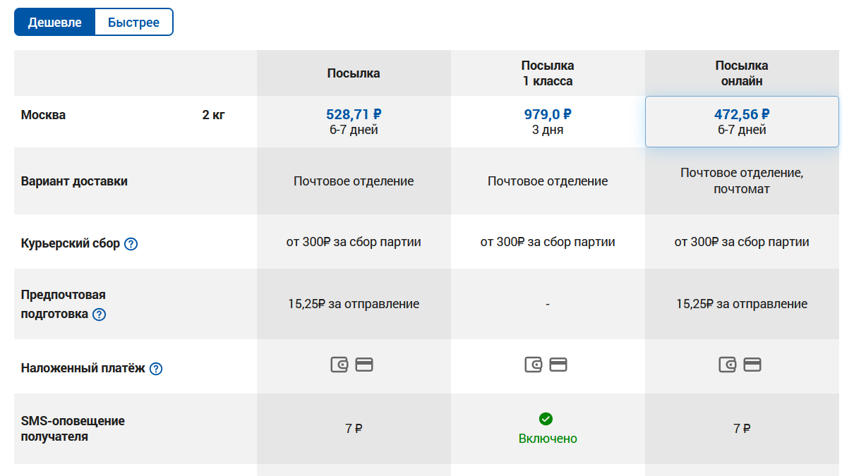 При тех же вводных, что и в предыдущем случае (из Новосибирска в Москву), цена составит от 472,56 рублей. Это в несколько раз меньше, чем стоимость курьерской доставки в предыдущем варианте. Правда, скорость в 3 раза меньше — 6-7 дней.