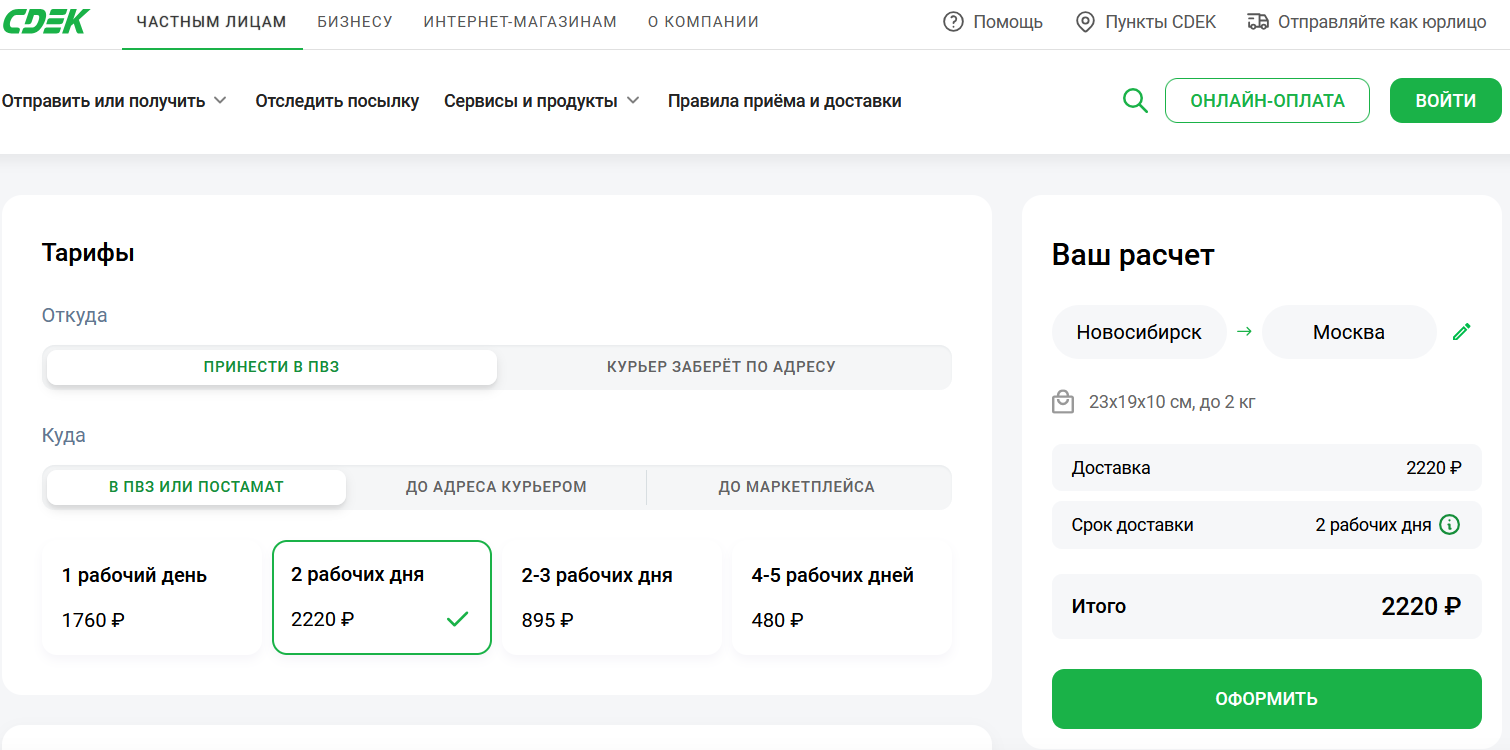 Отправить посылку от ПВЗ CDEK’а в Новосибирске, чтобы покупатель забрал ее в ПВЗ того же CDEK’а в Москве, обойдется вам в 2 220 рублей при сроке 2 дня.