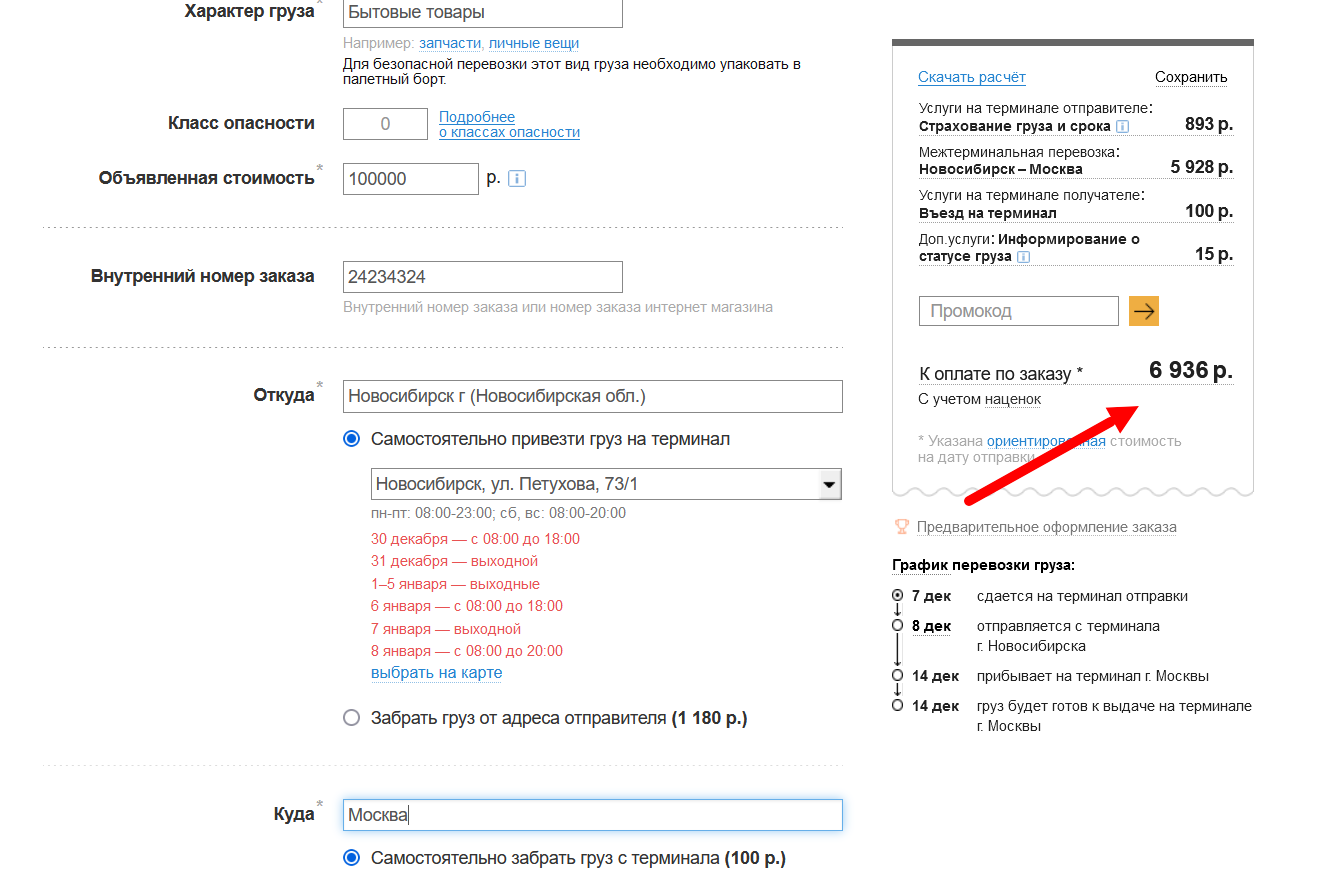 Цена здесь одна из самых низких: переправить груз весом 300 кг и размером 1х1х1 м из Новосибирска в Москву обойдется всего в 6 936 рублей.