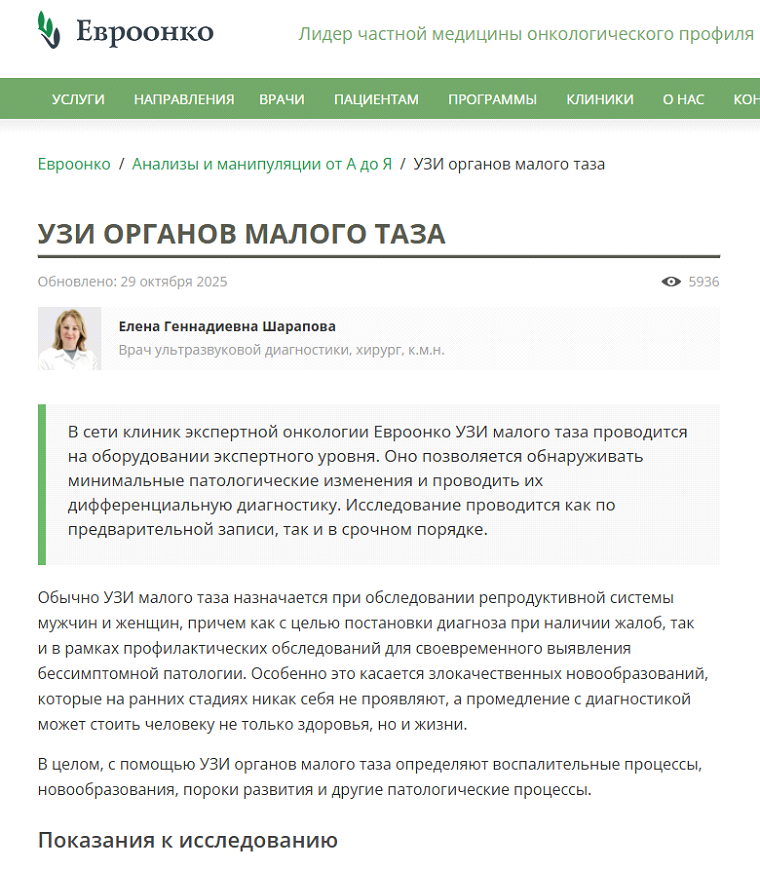 Страницы услуг, карточки препаратов, статьи, карточки врачей, прайс-листы, сервисные страницы, отзывы |