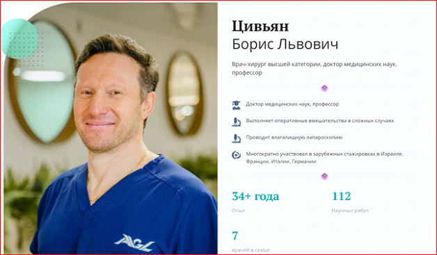 Страницы и профили врачей и подробной информацией об их регалиях, опыте, достижениях.
