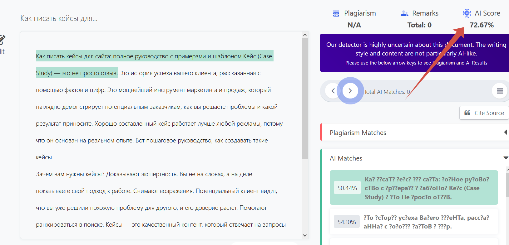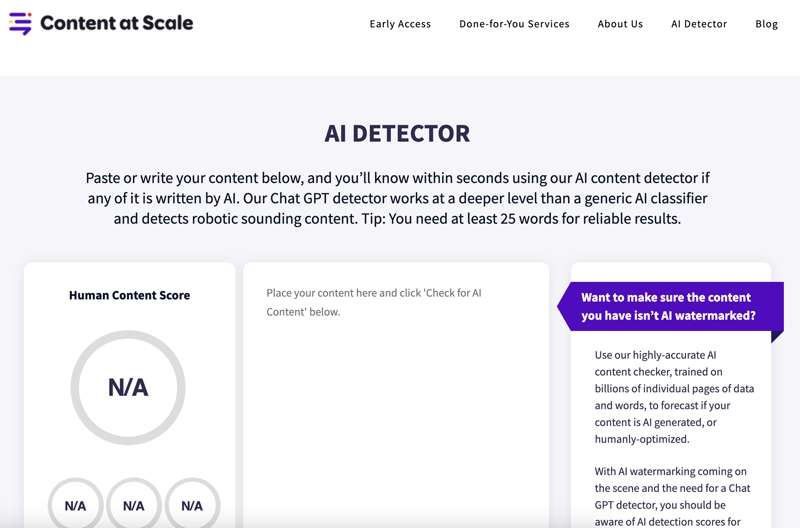 Сейчас в сервис добавили эффективный детектор искусственного интеллекта, который проверяет написанный контент. Детектор хорошо справляется с контентом низкого качества.
