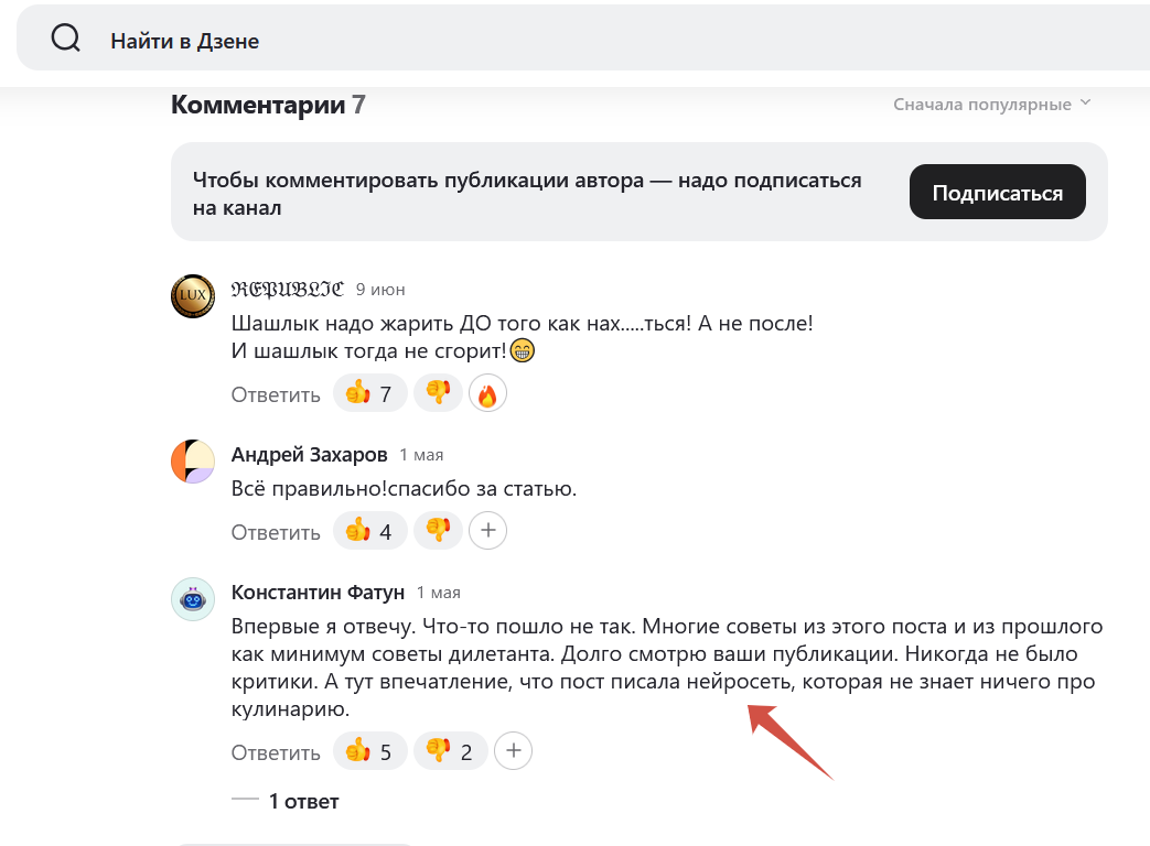 - Пример: Блог известного кулинара, который всегда славился живыми, полными юмора и личных впечатлений историями, начинает публиковать сухие, шаблонные рецепты, сгенерированные ИИ. Ну, знаете, вот это: «При приготовлении шашлыка главное правильно выбрать мясо и не передержать его на огне». Его постоянные читатели сразу чувствуют подмену и разочаровываются, чувствуя, что с ними больше не хотят говорить по-человечески.