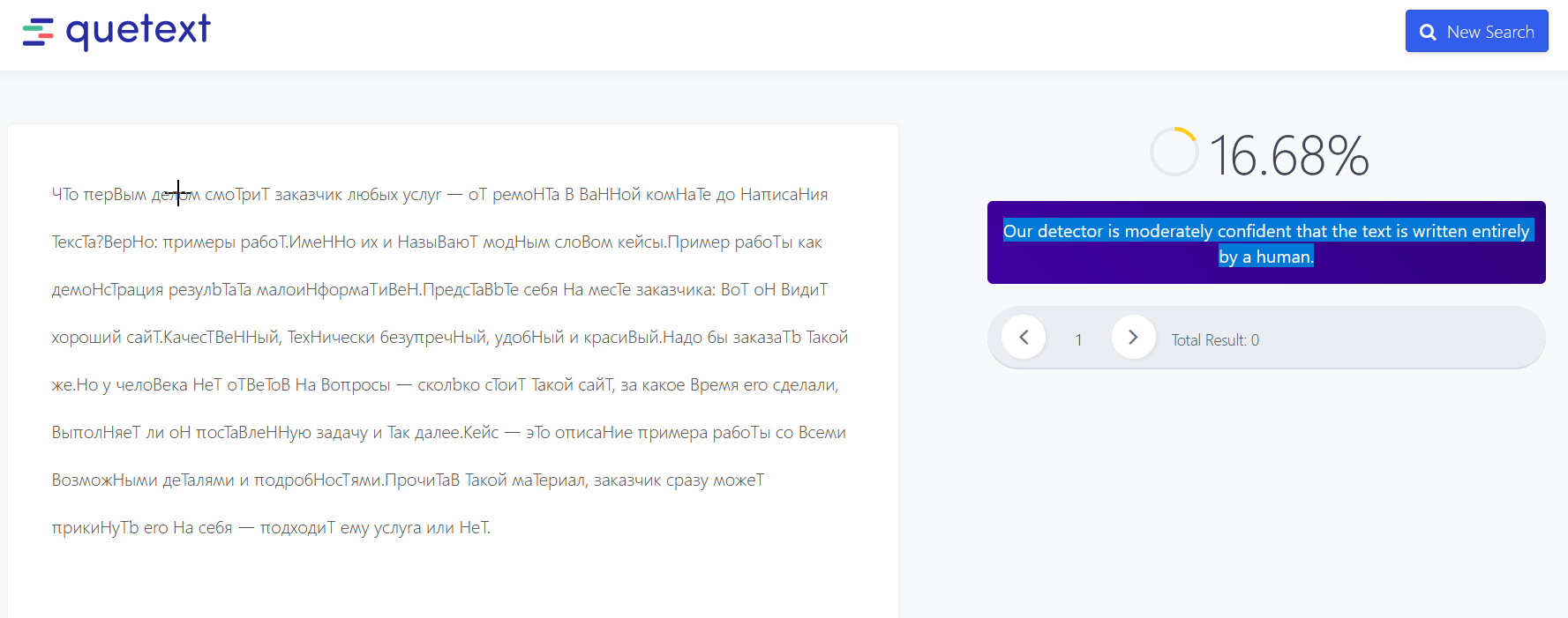Теперь — к тому, как выглядел эксперимент. Я наглядно покажу это в виде скриншотов проверки через один из популярных (и одним из самых строгих) сервисов — Quetext. Затем по такому же алгоритму проверю тексты через другие программы, но описывать это не стану — сведу все в итоговую таблицу.