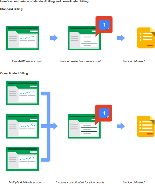 Google выкатил «Консолидированные счета» (Consolidated Billing) для агентств и крупных рекламодателей, ведущих несколько аккаунтов через единый кабинет Центра клиентов (MCC) Adwords. Новая биллинговая система объединяет счета нескольких аккаунтов в один.