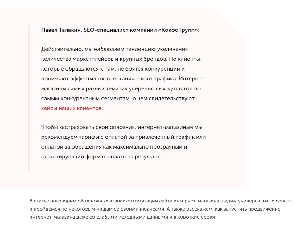 - Цитата — слова эксперта, руководителя или сотрудника компании, клиента — то есть любого человека, чья прямая речь уместна в тексте. Она используется, чтобы усилить экспертность текста, выделить основную мысль, передать эмоции и мнения. Пример цитаты вы уже увидели выше.