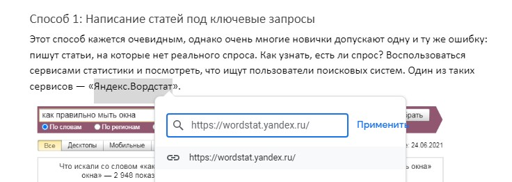 Чтобы вставить ссылку в «Google Документах», выделите левой кнопкой мыши нужные слова, затем нажмите правую кнопку и кликните по слову «Ссылка» (или нажмите сочетание клавиш Ctrl +K). В открывшемся окошке вставьте нужную ссылку и нажмите «Применить»: