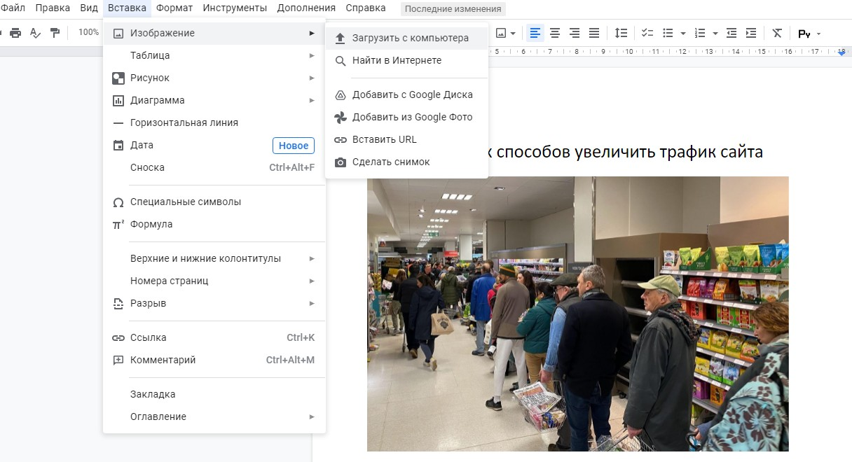 Это картинки, фотографии, скриншоты, мемы, которые должны проиллюстрировать текст. Вставляются прямо в документ нажатием сочетания клавиш Ctrl+V или через команду меню «Вставка» → «Изображение» → «Загрузить с компьютера»: