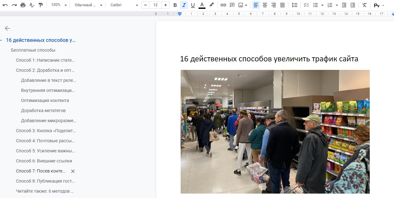Подзаголовки должны быть грамматически согласованными с заголовком статьи. В Google Docs это можно проверить, если выполнить команду «Вид» → «Показать вкладки и боковую панель со структурой» (Ctrl + Alt + H).