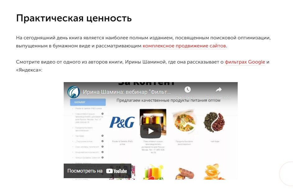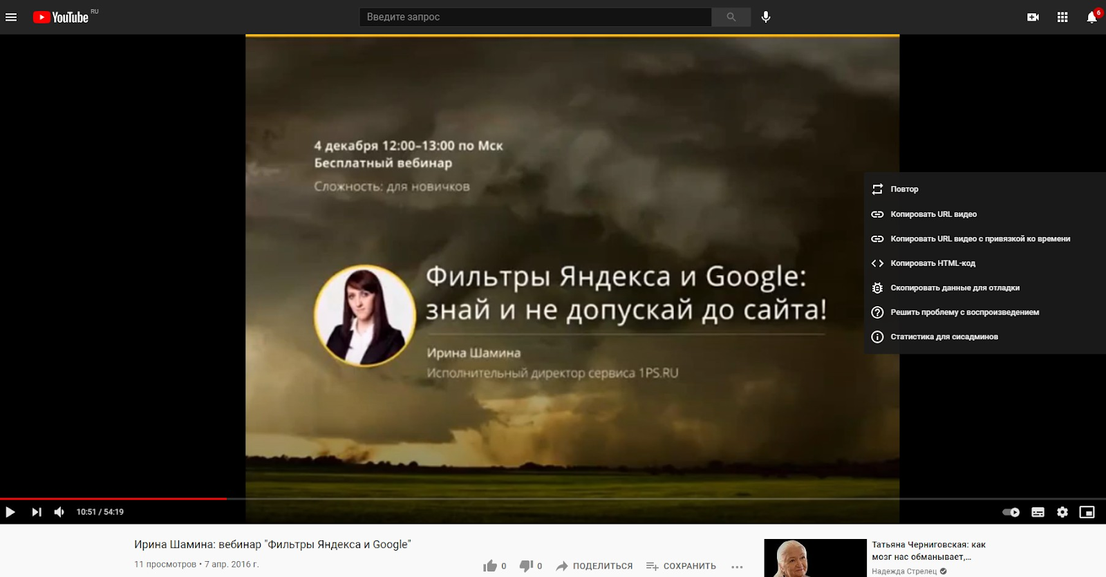 Вот как мы вставили в текст видео на примере статьи «7 книг по SEO в 2021 - учебники по продвижению и оптимизации сайта». Нашему главреду захотелось показать автора книги, что называется, «лицом». Для этого он ввел в поисковой строке YouTube имя и фамилию автора, а также название книги. На появившемся ролике нажал правую кнопку мыши и в контекстном меню выполнил команду «Копировать URL видео»: