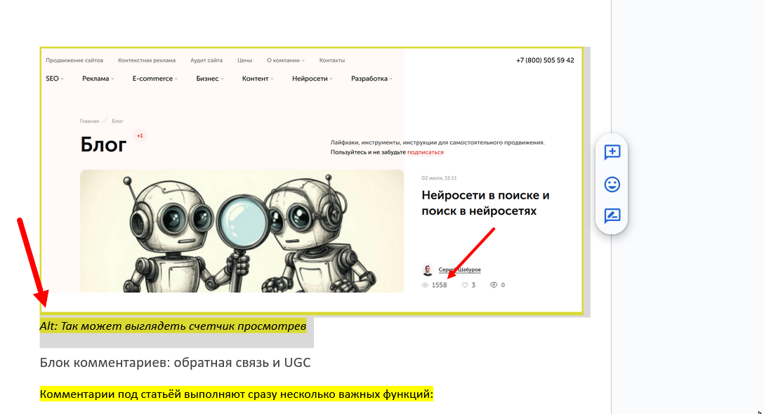 - Генерация UGC (пользовательского контента) — комментарии дополняют статью, добавляют новые смыслы и ключевые слова;
