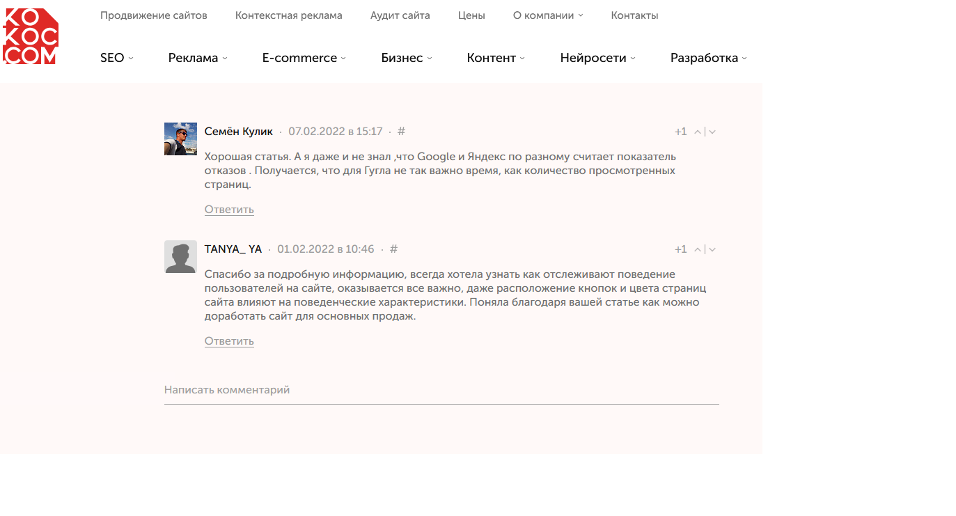 Поощряйте читателей задавать вопросы и делиться мнением — это увеличивает время пребывания на сайте и улучшает поведенческие метрики.
