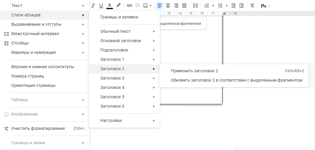 Также можно наложить заголовки в главном меню сервиса при выполнении команды «Формат» → «Стили абзацев»: