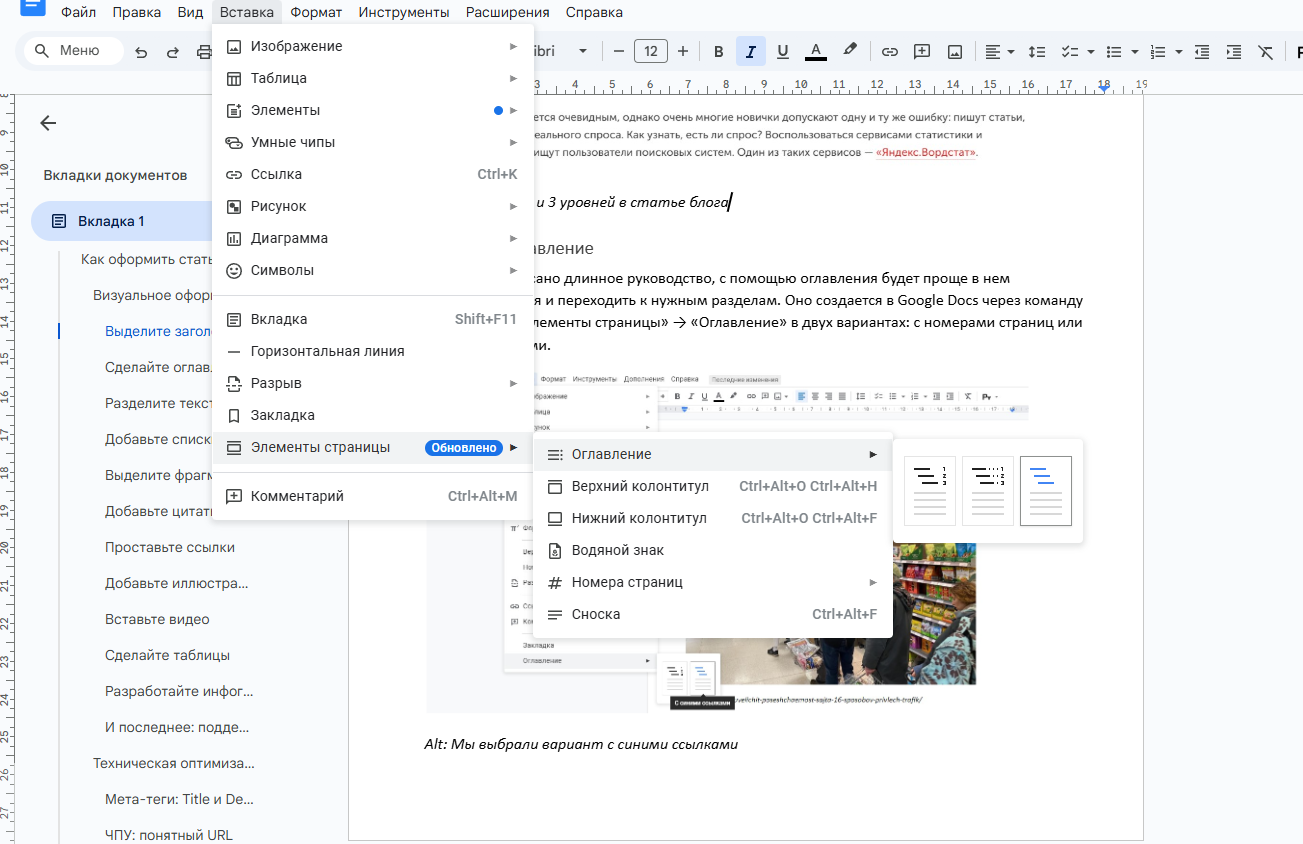 Если у вас написано длинное руководство, с помощью оглавления будет проще в нем ориентироваться и переходить к нужным разделам. Оно создается в Google Docs через команду «Вставка» → «Элементы страницы» → «Оглавление» в двух вариантах: с номерами страниц или синими ссылками.