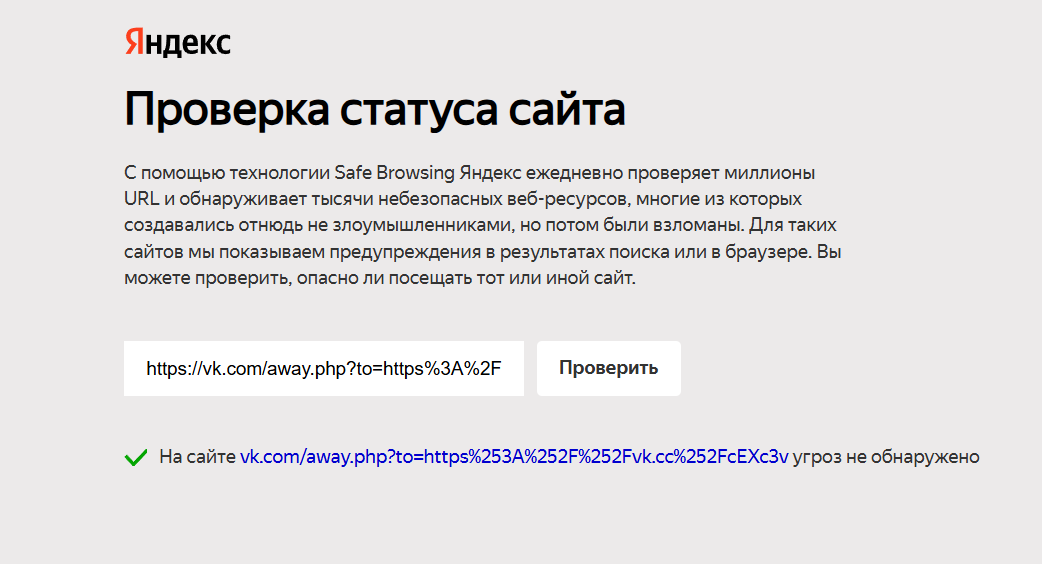 - Safe Browsing Яндекс. Бесплатный сервис для проверки ссылок онлайн. Просто добавляете ссылку в сервис, и он мгновенно выдает результат, но это не панацея и все равно подумать перед кликом.