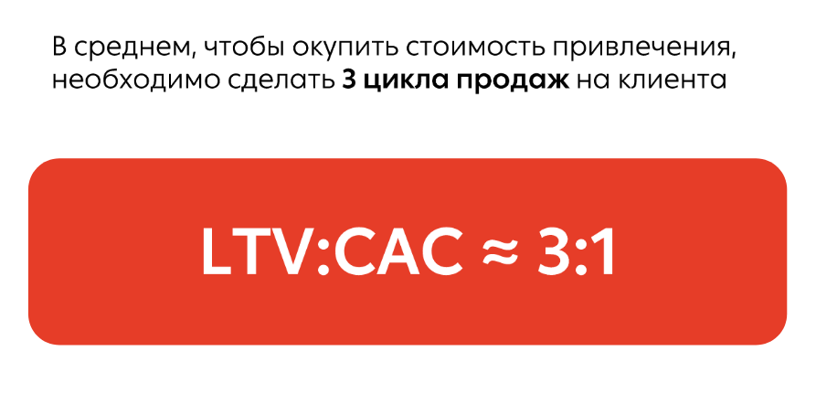 Привлечение клиента стоит денег. Эти вложения нужно окупить: для этого в среднем нужно, чтобы он купил у нас 3 раза. Да, это похоже на среднюю температуру по больнице и все зависит от ниши, продукта, маржинальности и так далее. Но усредненно это выглядит именно так: 3 сделки, чтобы окупить стоимость привлечения.