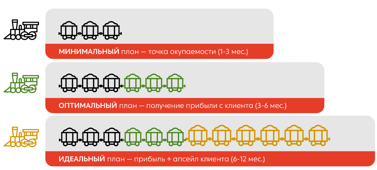 - Минимальный план (1–3 месяца): точка безубыточности. Цель — как можно быстрее окупить CAC за счёт первой и, возможно, второй сделки. Это план-минимум для выживания, но не для процветания.