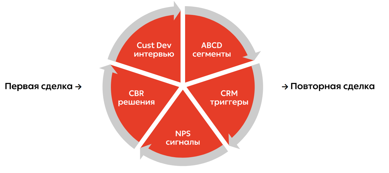 Первая сделка → Исследование → Сегментация → Персонализация → Повторная сделка. И так далее.