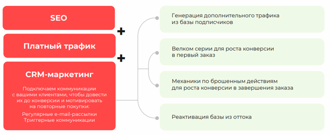 После работы над узнаваемостью логично подключать performance-каналы, SEO, контент-маркетинг и другие активности, направленные на прогрев аудитории и совершение конверсий. Главное — не останавливаться на одном рекламном канале, а использовать комплексный подход. Например, связку SEO + платный трафик + CRM-маркетинг. Каждый из этих каналов отвечает за свои задачи: