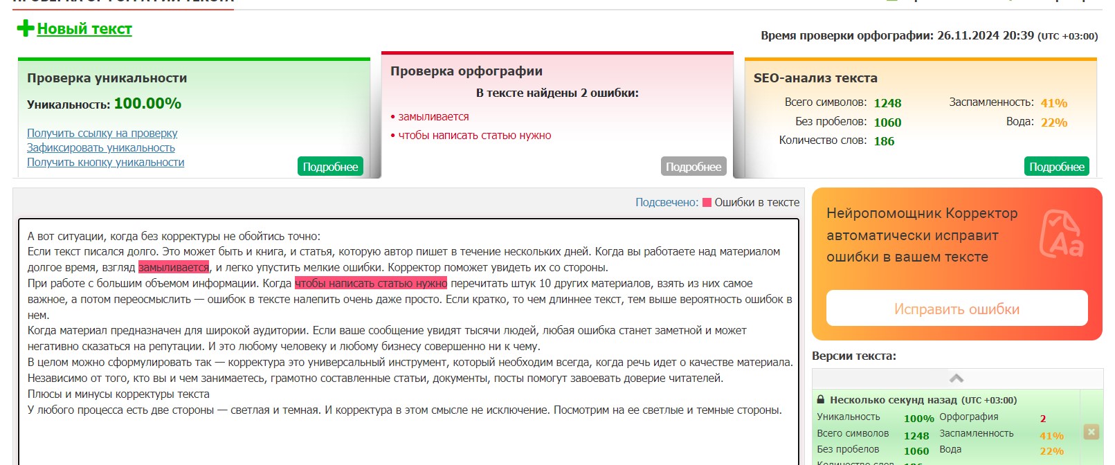«Орфограммка» находит орфографические, грамматические и стилистические ошибки, предлагает варианты исправлений. Сервис несложен, подходит, в том числе, для начинающих пользователей. Придирается сильно, ошибок находит много. Бесплатно можно проверить 6 000 знаков без пробелов, дальше тарифы начинаются от 150 рублей за 100 000 знаков.
