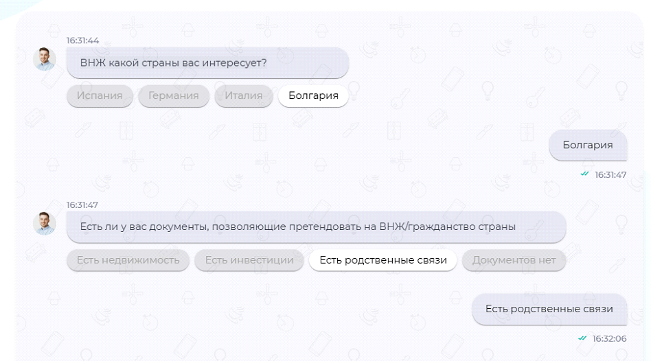 Посетитель общается с ботом и отвечает на вопросы, которые тот задает. По результатам он заполняет форму, после чего с ним связываются для уточнения деталей.