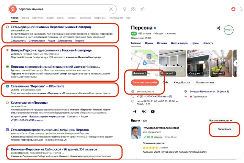 Аудитория приходит не только из поиска — с контекстной рекламы и РСЯ, Яндекс.Карт, по телефону, из медицинских агрегаторов типа ProDoctorov, мобильных приложений. Мы рекомендуем использовать максимальное количество каналов, ведь отсутствие любого из них — это потеря доли рынка.