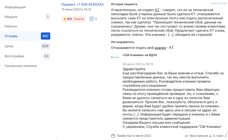 Работа с отзывами не ограничивается Яндекс Бизнесом или собственным сайтом. Нужна отработка негатива на агрегаторах, на площадках с профилями врачей, в отзывах по направлениям.