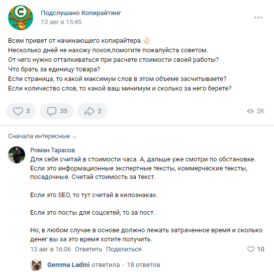 Другой пример — вы начинающий фрилансер. Например, копирайтер. Вы ищете единомышленников, чтобы спросить совета, посмотреть, как работают опытные коллеги и вообще — войти в тусовку своих. Легче всего это сделать, поискав в интернете профессиональные сообщества. Там коллеги, полезная информация, возможность задать вопросы и и даже найти заказчика.
