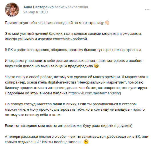 Пишите экспертные посты, публикуйте кейсы и работы из портфолио, выкладывайте отчеты с мероприятий, делитесь своими мыслями и опытом. Это поможет не только представлять вас выгодно как специалиста, но и самому отслеживать свое развитие, сравнивать свои результаты с предыдущими годами. Напишите пост-знакомство, пригласите подписчиков рассказать о себе — вот и познакомитесь.