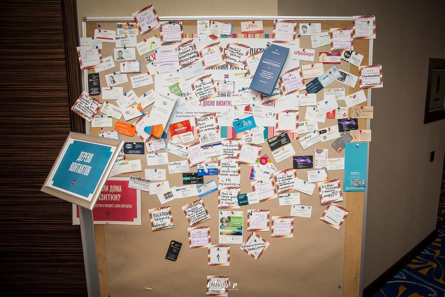 - Обмен визитками. Нужны для того, чтобы гости и участники мероприятия смогли максимально быстро поделиться информацией друг о друге. Сделайте небольшой стенд, на котором участники смогут закрепить свою визитку и взять чужую.