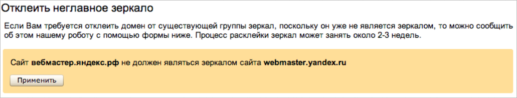 Для смены главного зеркала Яндекс по-прежнему советует использовать директиву Host. Назначением же нового инструмента является уведомление робота об изменении вебмастером адреса главного зеркала. Полученные указания будут применены Яндексом в поиске в течение 2—3 недель, если речь идёт о смене протокола или основного зеркала между доменами с www и без, и в течение 4—6 недель, если требуется переклеить любые другие зеркала.