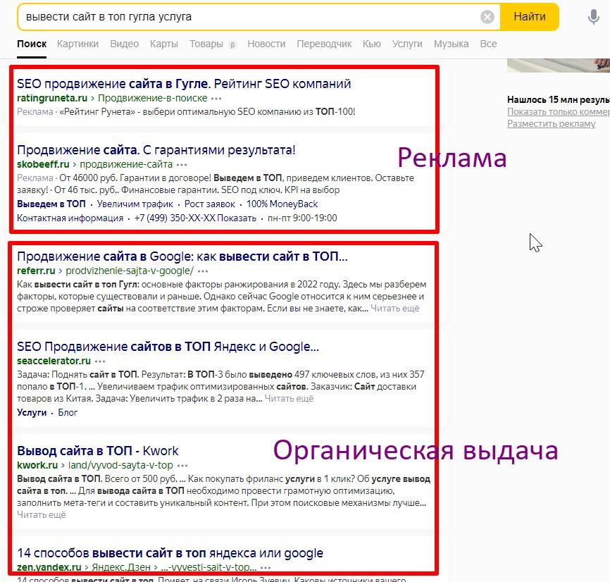 Рекламная выдача — это блоки с контекстной рекламой, которую дают компании, закупающие трафик. В «Яндексе» под рекламные блоки могут быть выделены до 4 верхних и до 5 нижних позиций выдачи, в Google — 1 позиция (блок из 4 графических объявлений) над и до 3 позиций под органической выдачей. Плюс в обеих поисковых системах есть еще и дополнительные рекламные блоки справа от основной выдачи.