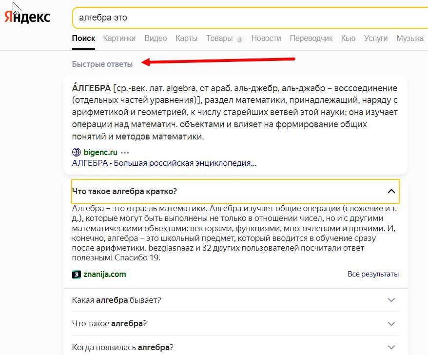 Быстрый ответ выдается на поисковой странице в ответ на некоммерческие запросы. Помогает получить краткую информацию по запросу без перехода на ресурс: