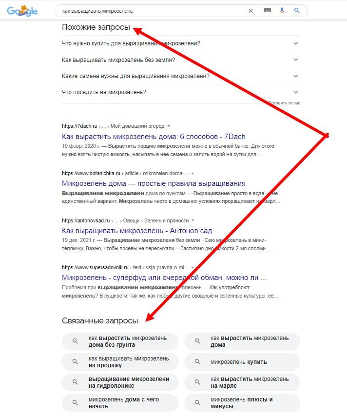 В Google вы всегда увидите на странице два блока подсказок — в средней части и внизу страницы.