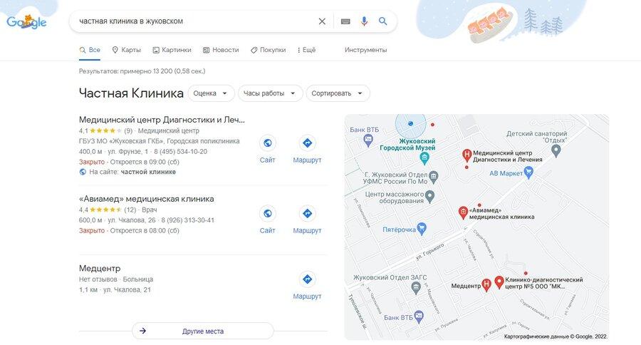 В Googlе в числе OneBox есть Google local pack: блок появляется вверху или в середине поисковой выдачи при вводе локального запроса. Например, “частная клиника в жуковском”: