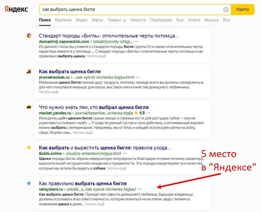 А в «Яндексе» он стоит по этому же запросу на 5 позиции: