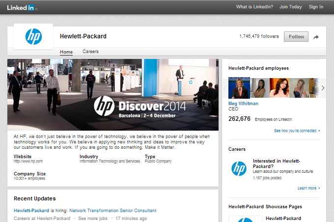 Пример бренда HP свидетельствует, что бизнес-профиль в социальной сети может быть эффективнее официального сайта компании. База подписчиков Hewlett-Packard в LinkedIn составляет почти 2 млн пользователей. При этом вся информация о товарах и услугах бренда сосредоточена на 10 витринных страницах.