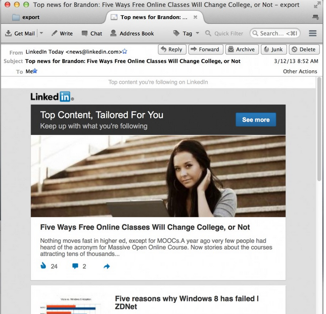 Отправляемые на электронные адреса юзеров дайджесты содержат краткие анонсы материалов со страниц компаний в LinkedIn. Для ознакомления с деталями каждому заинтересовавшемуся пользователю придётся перейти в профиль бренда в социальной сети.